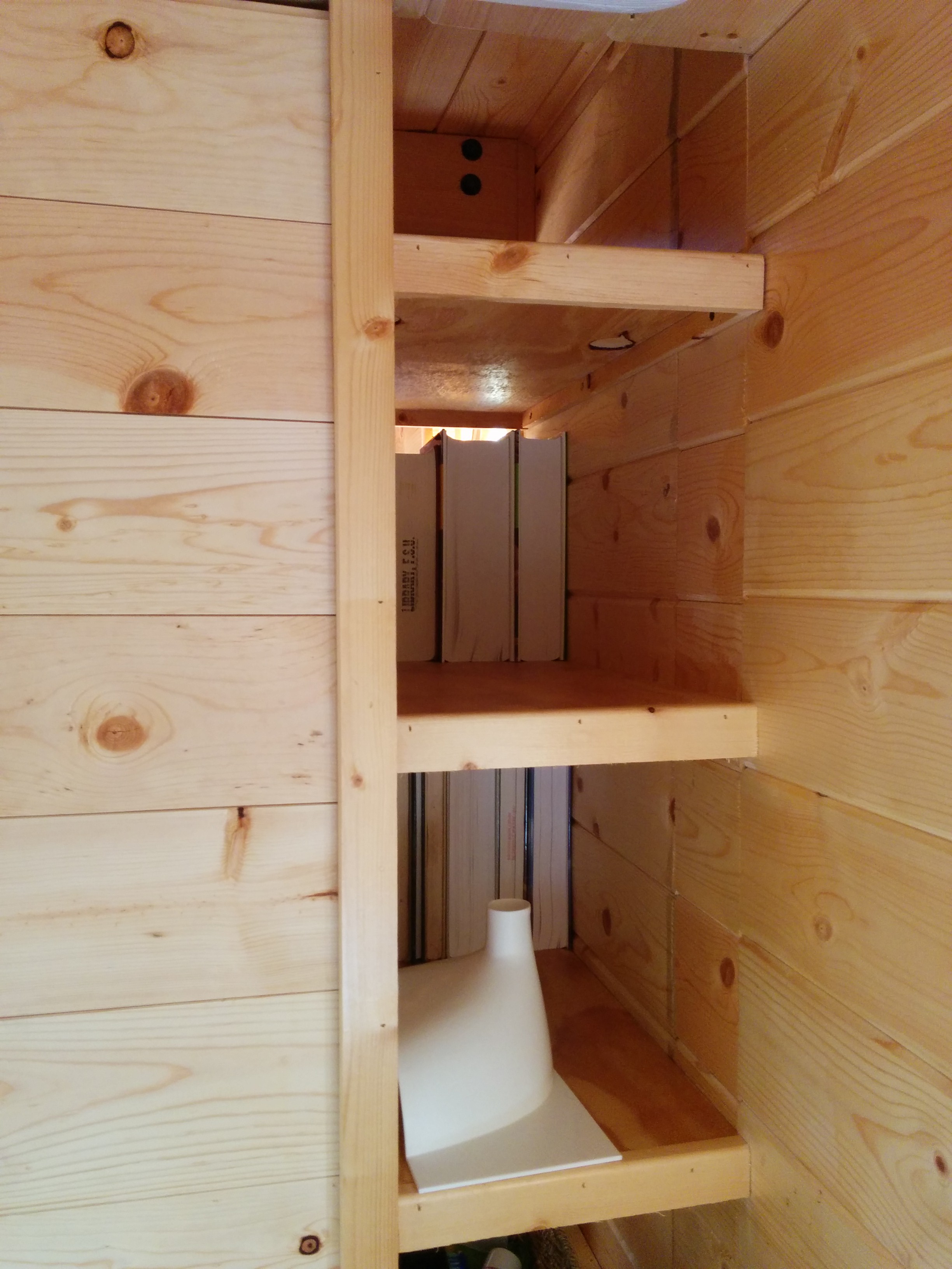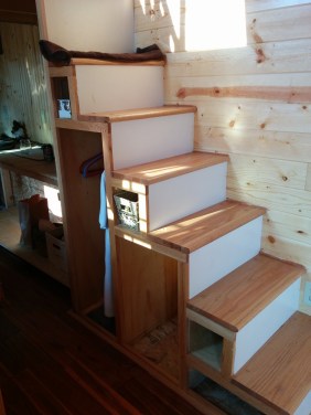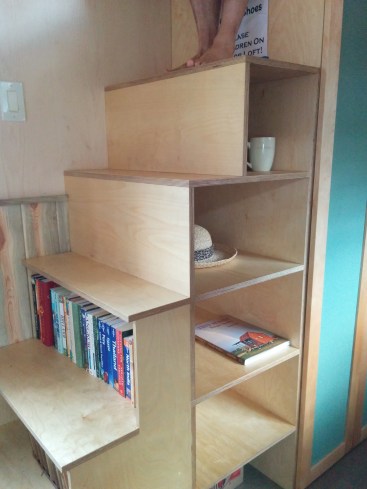 Moose’s outside living is minimal because he’s planning to move soon, but a small deck and chair still made all the difference.Kitchen beside the bathroom setup (the best I reckon). Unfinished with plans evolving as Moose uses it.Open stairs with different sized storage spaces.Clever double-sided shelves accessed from the living room and from the bathroom. They are tucked in the space behind the fridge.Moose’s loft is really nice. Headspace to sit up all the way across.