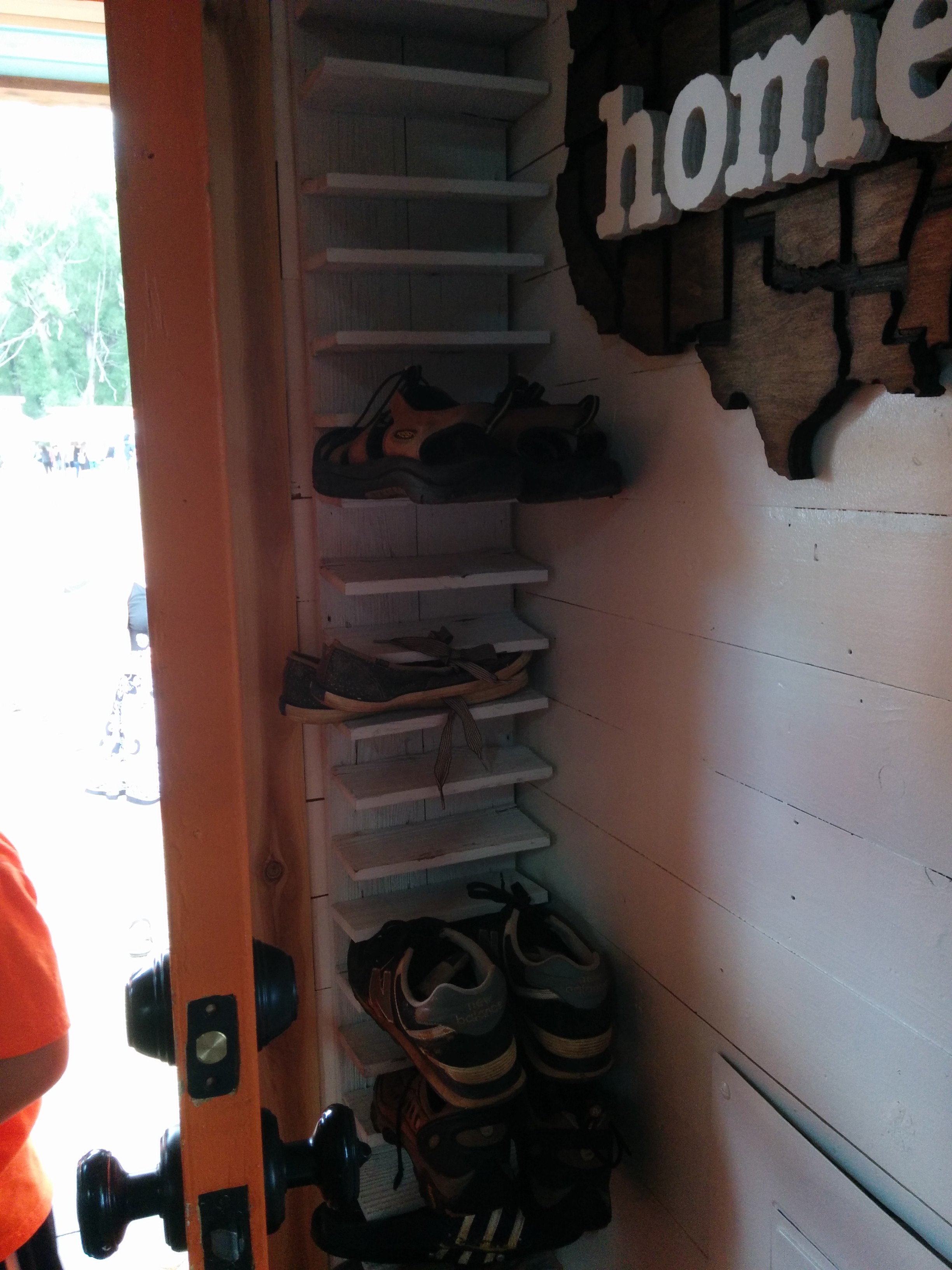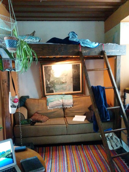 Loft bed. The interesting thing about it was that it was narrower at the foot than the head. Didn’t make a noticeable impact on sleeping. The ladder was annoying though. And if you do have a ladder, make sure you have flat rungs, not round.Freestanding cupboards and benches worked really well.
