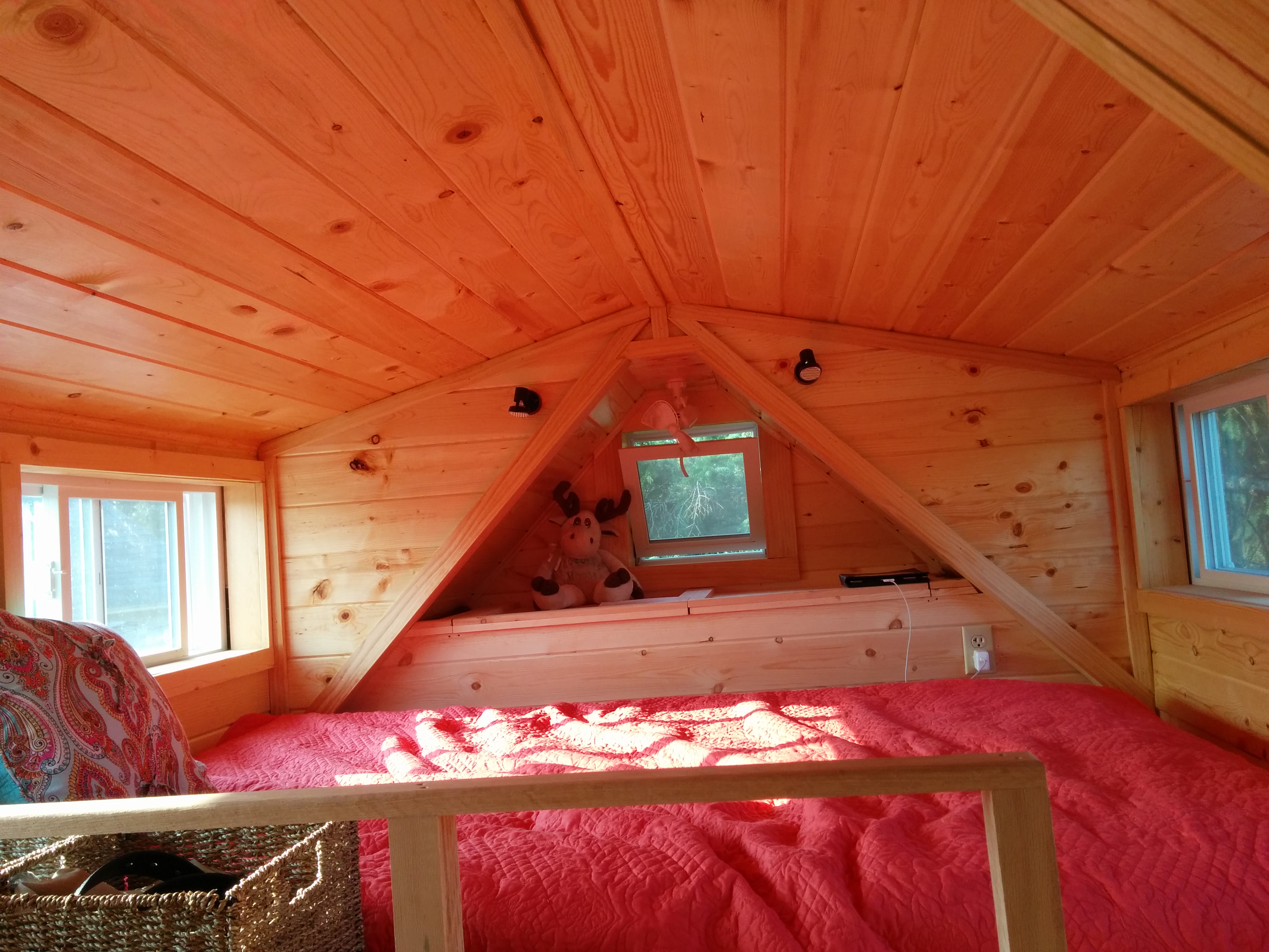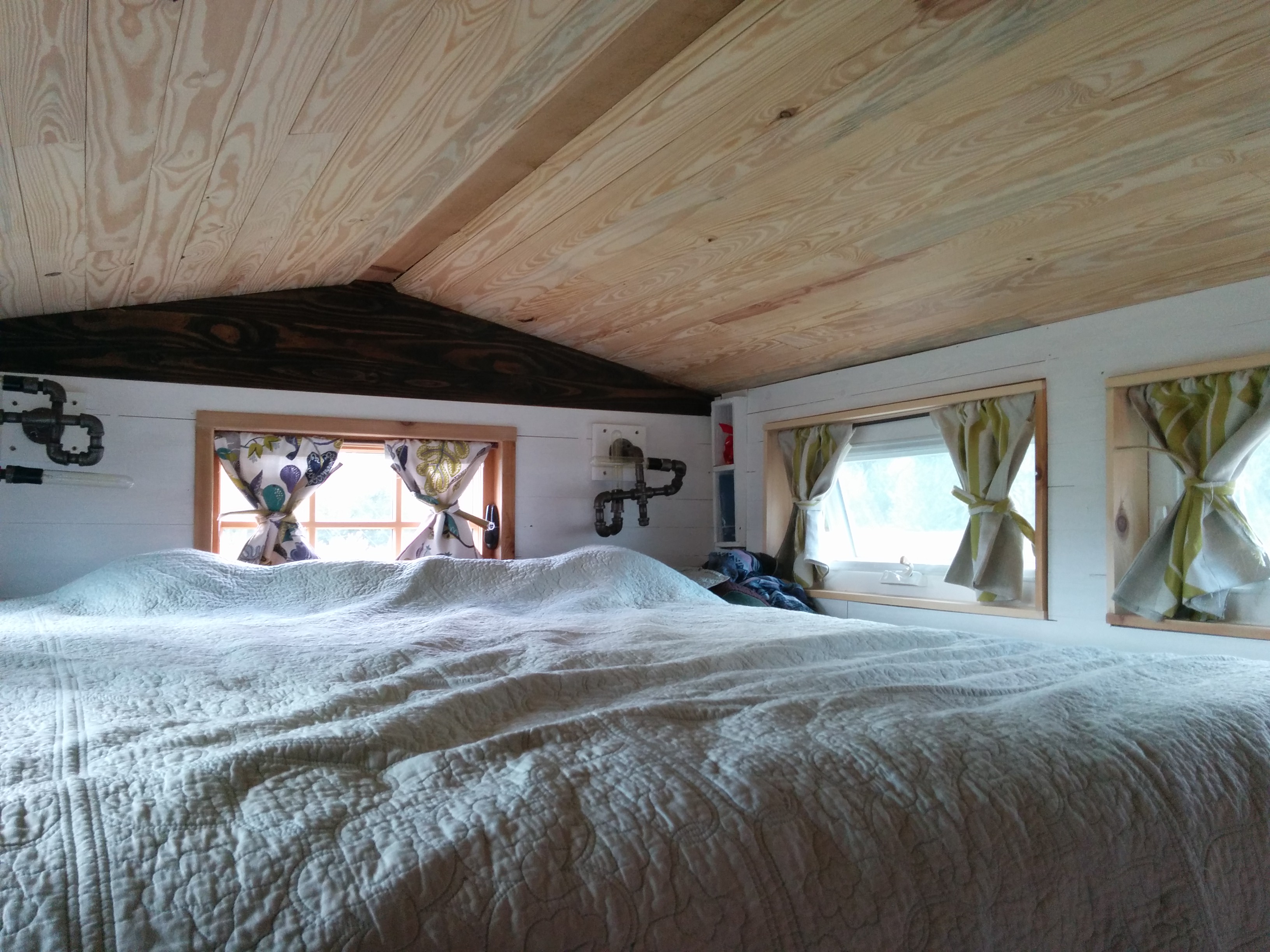 Tight lofts are unliveable – if you can only sit up in one end, or in the middle under the crest of the roof it really feels like you’re in a crawl space. Those dormer roofs, whilst tricky, are done for a reason. We saw loft beds and downstairs beds. Loft beds left more room downstairs, or allowed a smaller footprint, whereas downstairs beds crowded the floorspace, but did allowed a really airy feel. I think a tiny house for one person could get away with a well-incorporated downstairs bed, but for two people the separate space a loft provides would be really important.