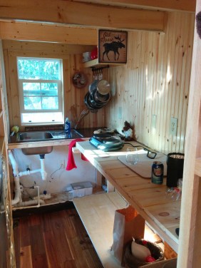 Moose, so-called because studying moose is his calling, had been in his house only a few months, and technically it wasn’t quite finished yet (the heater is only going in as you read this, just in time for freezing Michigan fall temperatures). I reckon moving in before totally finished is a great idea because you can get a feel for how you might actually want to finish it off – from practical experience rather than theory. The main things we learned from Moose were that his small bathroom and kitchen felt just right (an inch of headroom below the loft rafters is enough) and that if you build it, they will come – both figuratively, in the case of finding somewhere to both build and then to park his house, and literally, in the case of nosy passers-by who want to tour your house all the time. (Moose assured us we didn’t fit into this category since we already knew all about tiny houses).