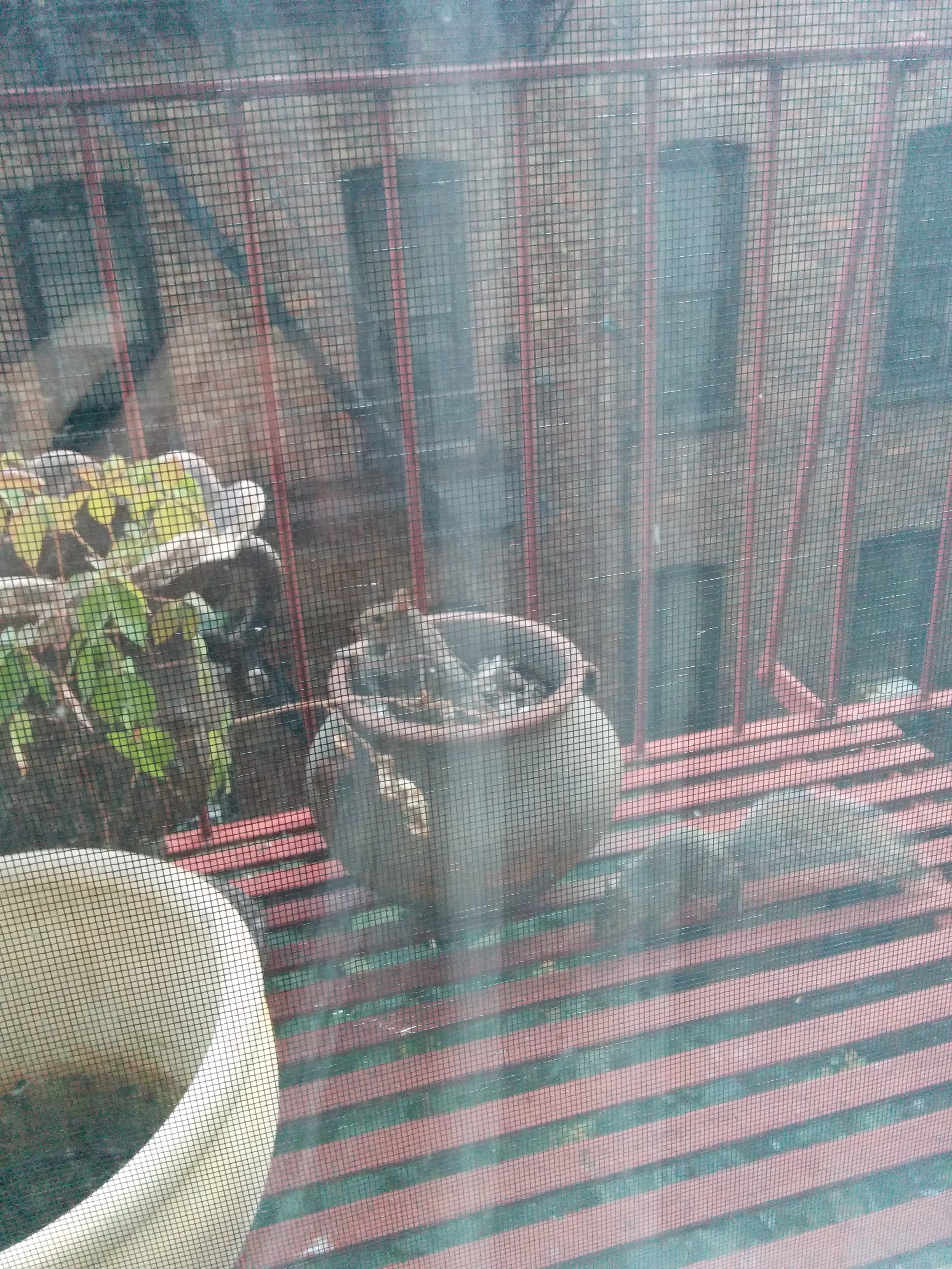 I have a plan to capture the squirrel when she is sleeping by putting an oven tray over her pot and bringing it inside. Kind of like catching a spider, except in that case it’s going outside. A says there will be biting and scratching.