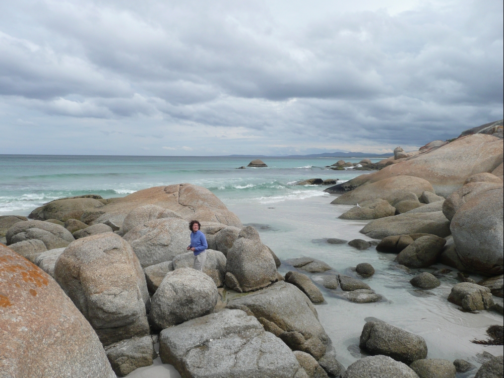 So the real Bay of Fires starts at Ansons Bay and continues north to Eddystone Point, the easterly-most point in Tasmania (or maybe St Helens point is, they both claim it). It got its name from Tobias Furneaux who sailed past in 1773 and could see hundreds of aboriginal camp fires burning the whole length of it. The orange-lichen-covered rocks reflected the flickering firelight, and he christened it the Bay of Fires. The actual bay is only a small section of the coast, but the orange rocks and white sands continue for miles and miles, extending as far south as Binalong Bay. (The orange rocks are in fact found down in Freycinet NP, up through Flinders Island and as far as Wilson’s prom). The white sands and the clear, clear waters are what make Bay of Fires extra special. Of course, Leonie and I couldn’t resist a swim even though it was still cold and windy. We jumped in at Bailey’s Rocks, right near the Bay of Fires resort. We’d love to come back and camp up here in some sunny weather.