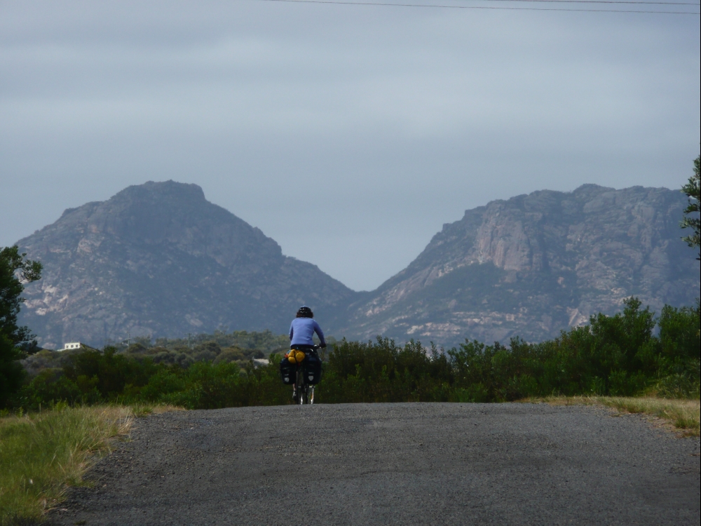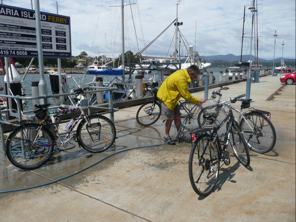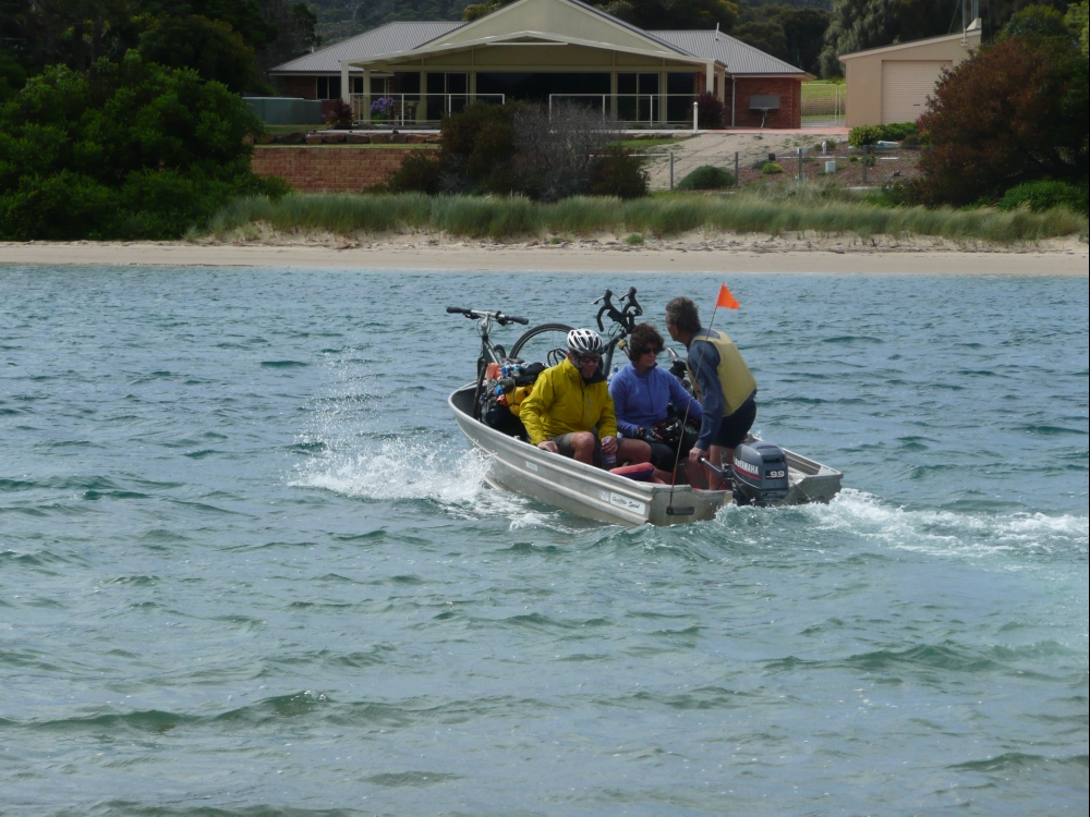 We had an 18km ride out to the end of Nine Mile Beach, a lovely ride through endless beah shacks hidden in bushland. We ended up just across the water from Swanick, near Coles Bay. An old guy, Kirk, and his wife run a dinghy ferry service especially for cyclists from the end of the spit the few hundred metres across the river mouth to Swanwick. Saves us around 50km of riding into Freycinet NP. He was a bit of a grumpy sort who made us manhandle our bikes ASAP into the boat, but we were greeted on the other side by his wife who had brought us maps of Coles Bay and a towel to dry our feet! They’ve been running the ferry for 23 years and it will be a sad day when they stop.
